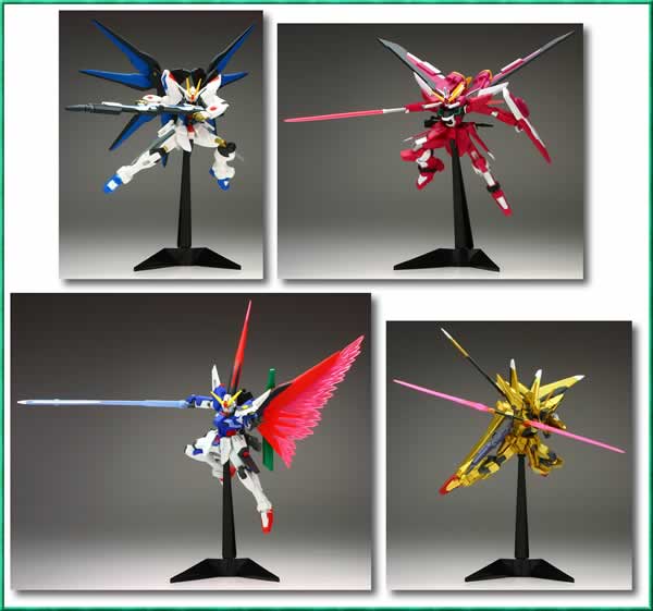 定価500円(税別) 全4種 ●ZGMF−X20A ストライクフリーダムガンダム ●ZGMF−X19A インフィニットジャスティスガンダム ●ZGMF−X42S デスティニーガンダム ●ORB−01 アカツキ ※全高約19.5〜22.7cm(台座含む) ※2006年2月発売